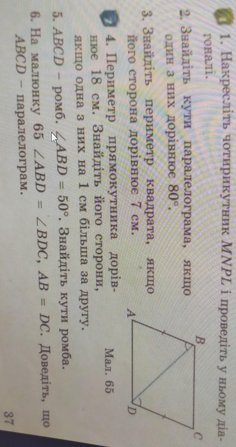 5. АБ =СД, отсюда БС=АД у паралелограма противоположные стороны равны, так же на рисунке видно, что угол АБД и ДБС равны, отсюда выплывает что и противоположные углы так же попарно равны. Угол А=С, угол В=Д