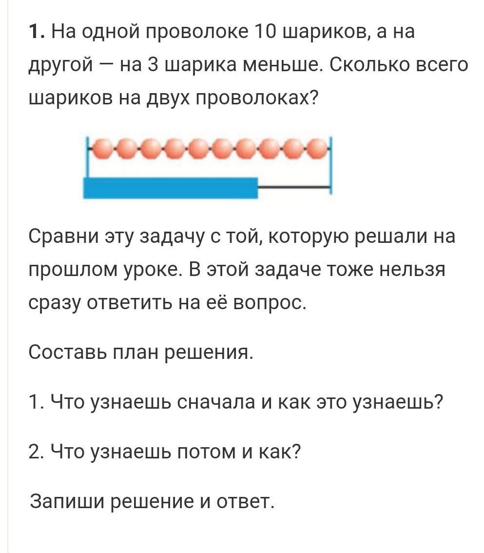 Для начала, найдём, сколько шариков на второй проволоке. Для этого от количества шариков на первой проволоке отнимем три шарика. Получим: 10-3=7 шариков.