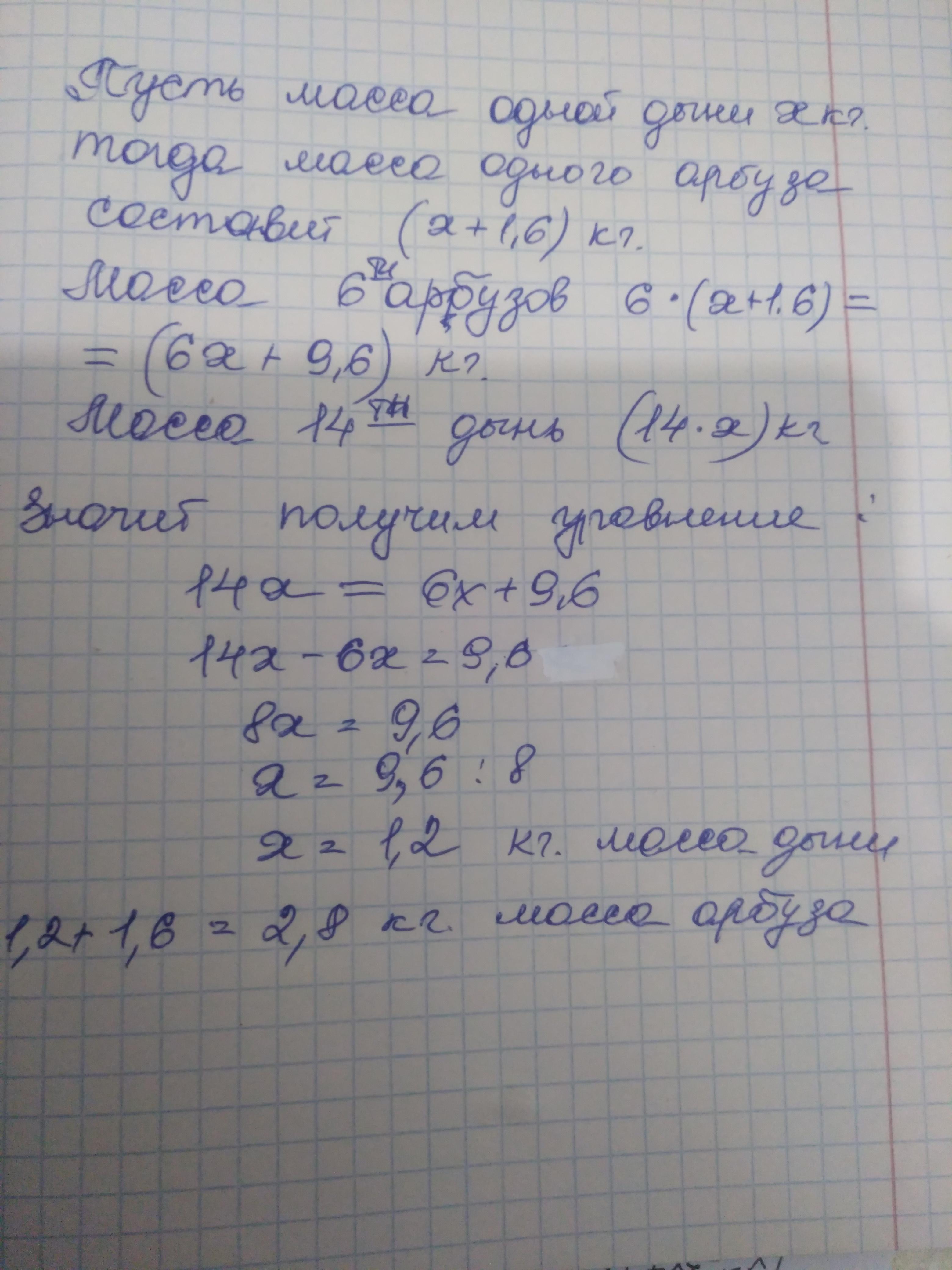 Масакавуна більше маси дині на 1,6 кг. Знайдіть масу кавуна і масу