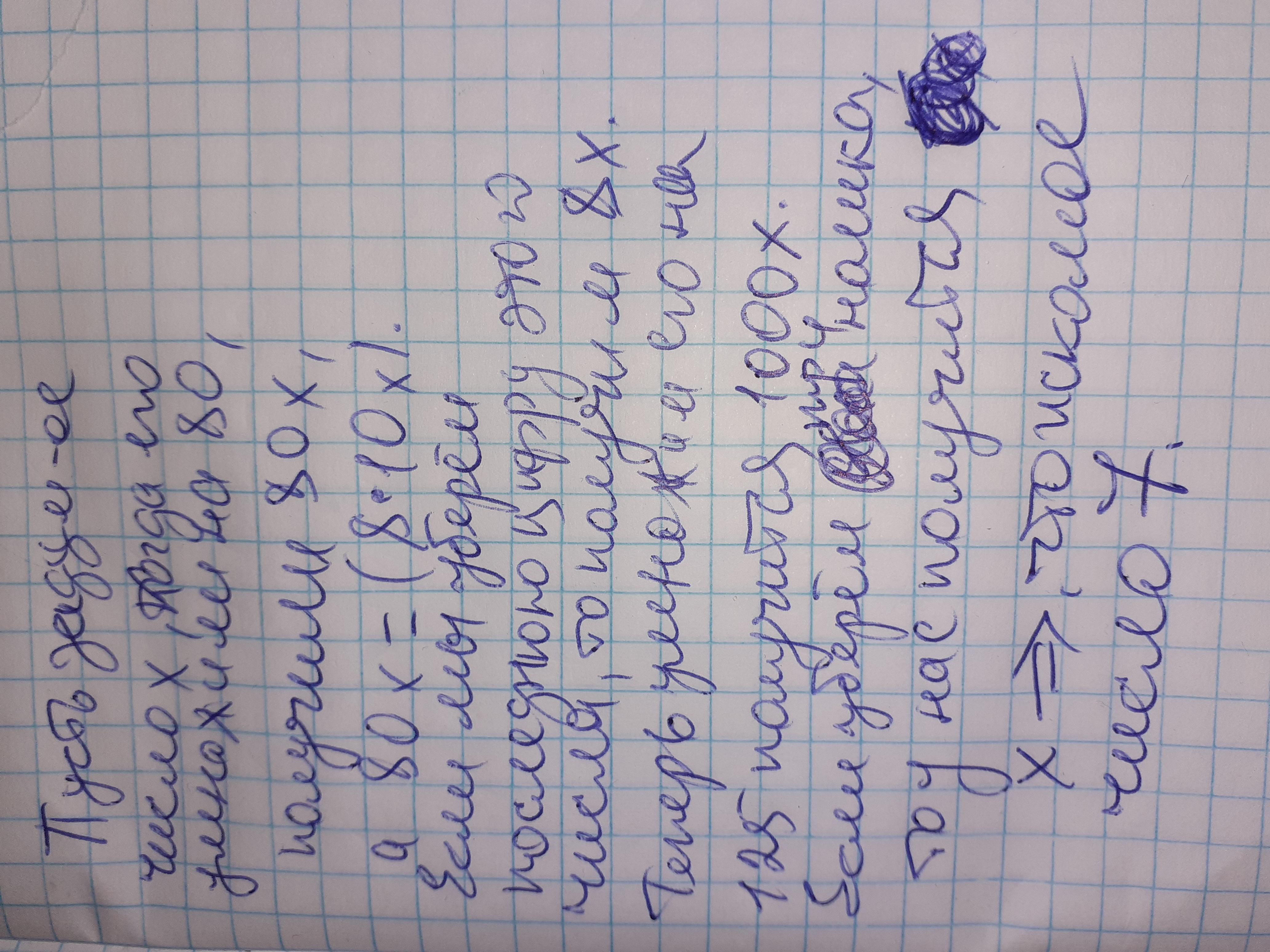 задумалр число умножили его не 80;зачеркнули последнюю цифру резкльтата пооученное число умножили на 125 зачеркнули три последгие цифры результата и получили 7 какое число задумали