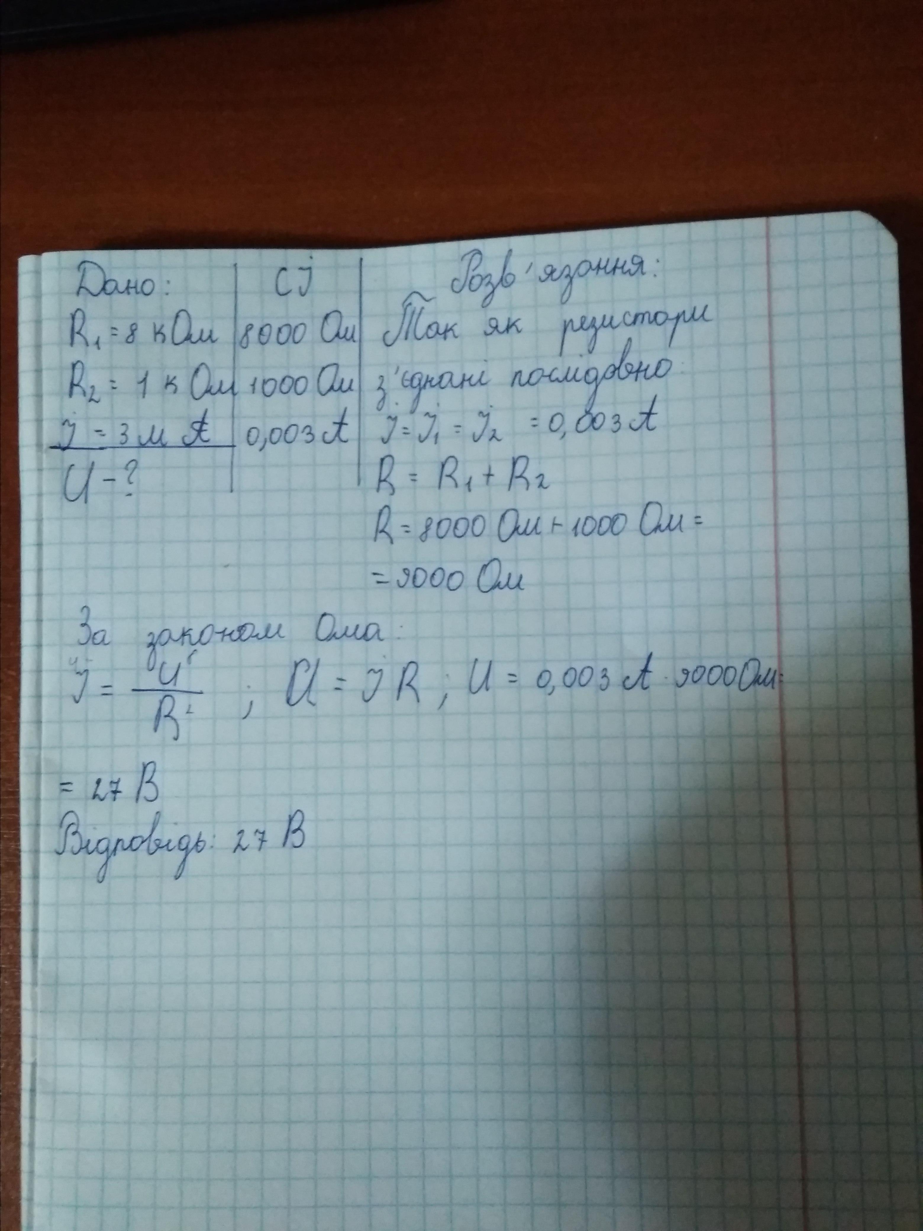 Два резистора, опори яких 8 і 1 кОм, з'єднанi послідовно. Визначте покази вольтметра на кінцях ділянки кола, якщо сила струму в колі 3 мА
