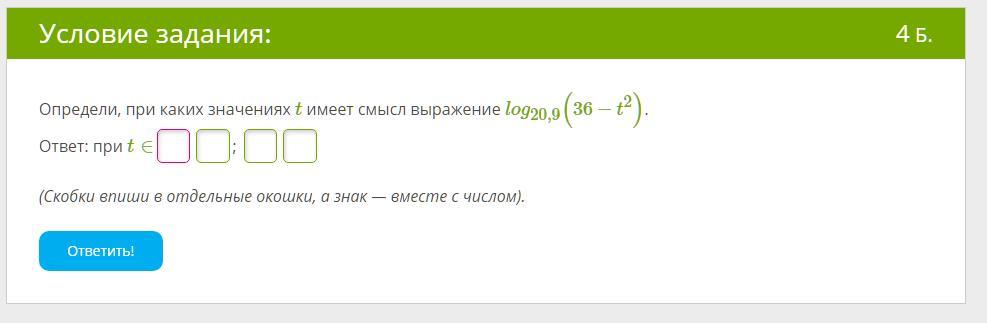 Объяснение: здесь логарифм имеет смысл при 36-t^2 > 0 => t^2 < 36 => -6<t<6