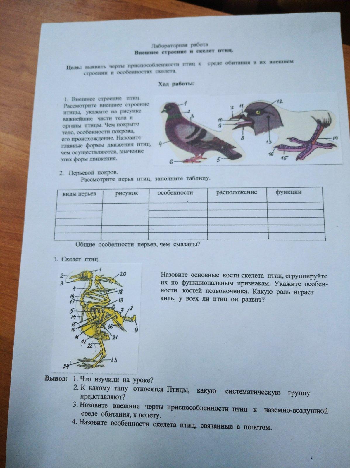 1. Подвижная шея соединяет голову с компактным туловищем. Передние конечности птицы видоизменены в крылья. Задние конечности - ноги. На концах пальцев есть когти. Перья, которыми покрыто тело, образованы из рогоподобного вещества и служат приспособлением к полету, предохраняют птицу от охлаждения и перегрева, создают обтекаемую поверхность тела, защищают кожные покровы от повреждений.