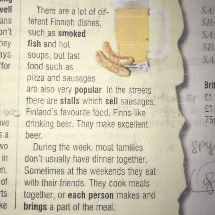 There are lots of Finnish dishes, but fast food are the most popular. Finns like drinking beer, which they make perfectly. Most families sometimes are eating with their friends. They cook meals together and each person not only makes, but also brings a part of their meal.