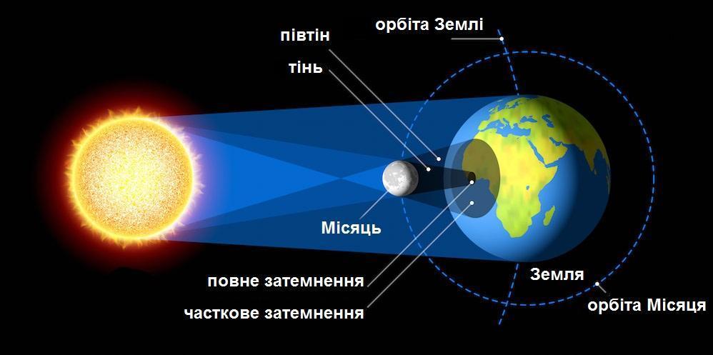 Затемнення Сонця відбувається, коли Місяць розташовується між Сонцем і Землею і в такий спосіб перекриває потік сонячного світла.