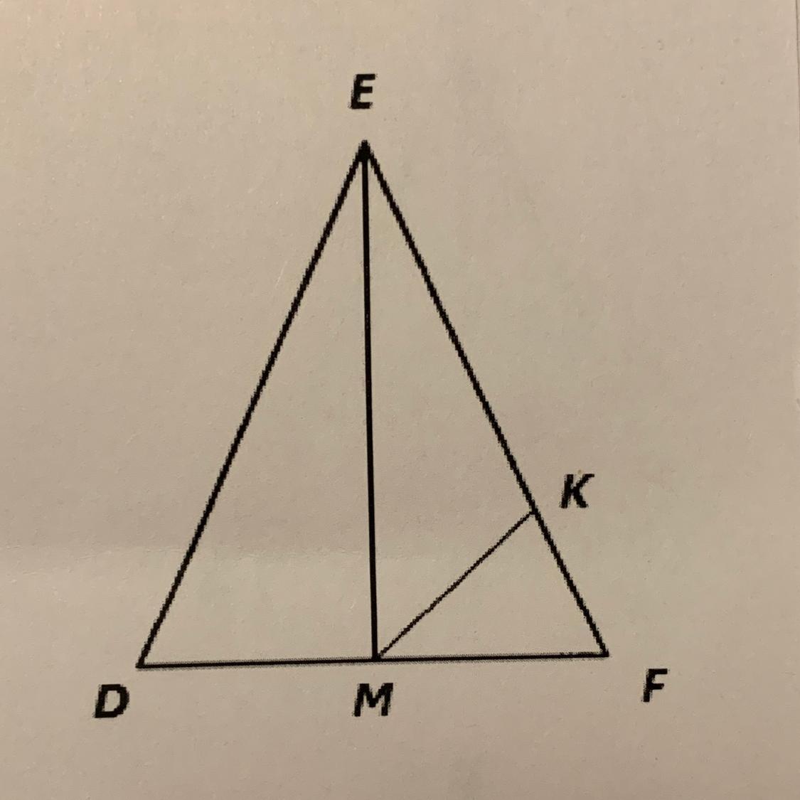 В равнобедренном треугольнике медиана равна высоте(EM-медиана, поскольку по условиям задачи, DM=MF).Поскольку EM- высота, угол EMF=90.