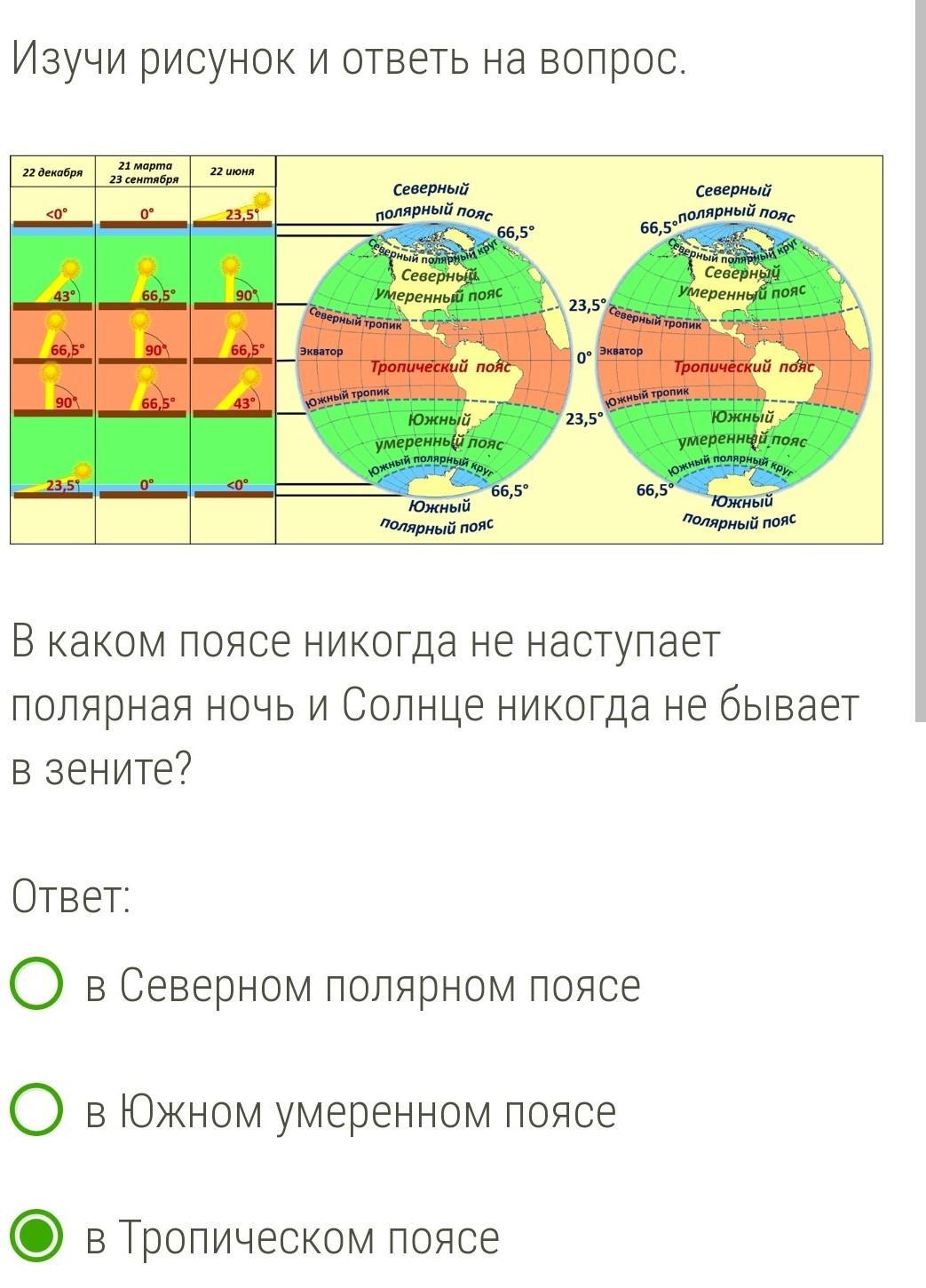 Два умеренных пояса освещенности отличаются от прочих тем, что за год на любой из широт каждые 24 часа делятся на дневное и ночное время. Солнце здесь никогда не бывает в зените. Полярные пояса освещенности хранят в себе секрет такого природного явления как полярный день и полярная ночь.