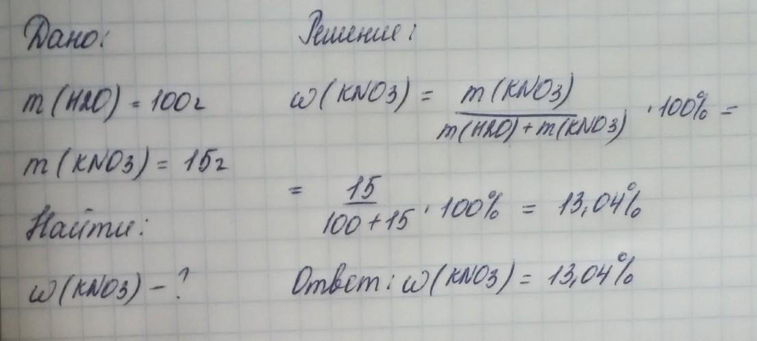 У 100г води розчинено 15г калію нітрату KNO3. Визначити масову частку нітрату калію в розчині. Помогите прошу