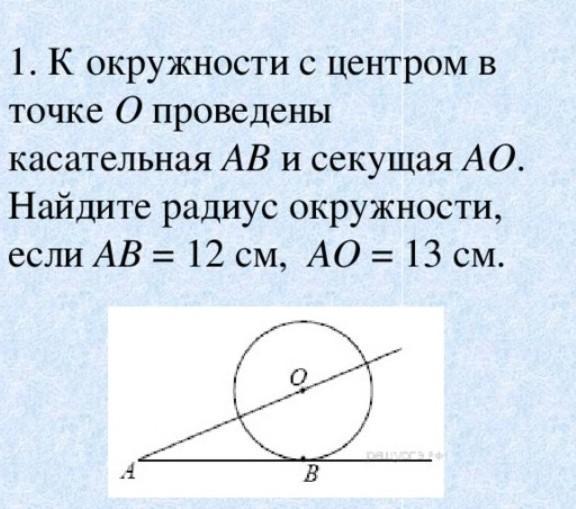 Средним точки О и В. ОВ- радиус.Рассмотрим треугольник АВО. Он прямоугольный, так как косательная проходит перпендикулярно радиусу. Воспользуемся теоремой Пифагора