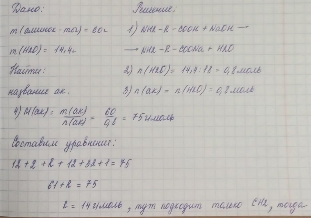 Помогите пожалуйста Если в результате реакции неизвестной аминокислоты массой 60 г с NaOH выделяется 14,4г воды .Определите название данной аминокислоты.