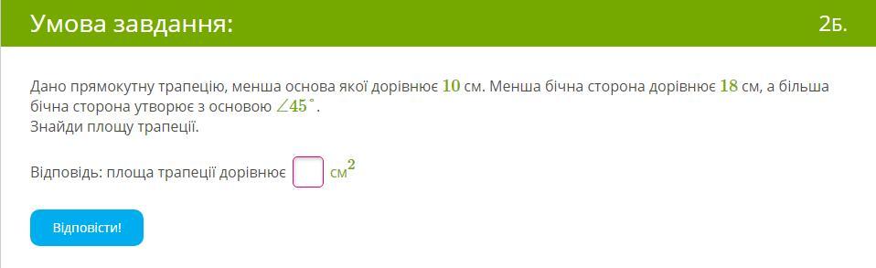 кут D=45°, то кут HCD=45° також,то трикутник HCD рівнобедренний,тому HD=НС=18см. то АD =10+18=28. підставляємо під формулу. S=(a+b)÷2×18=342.