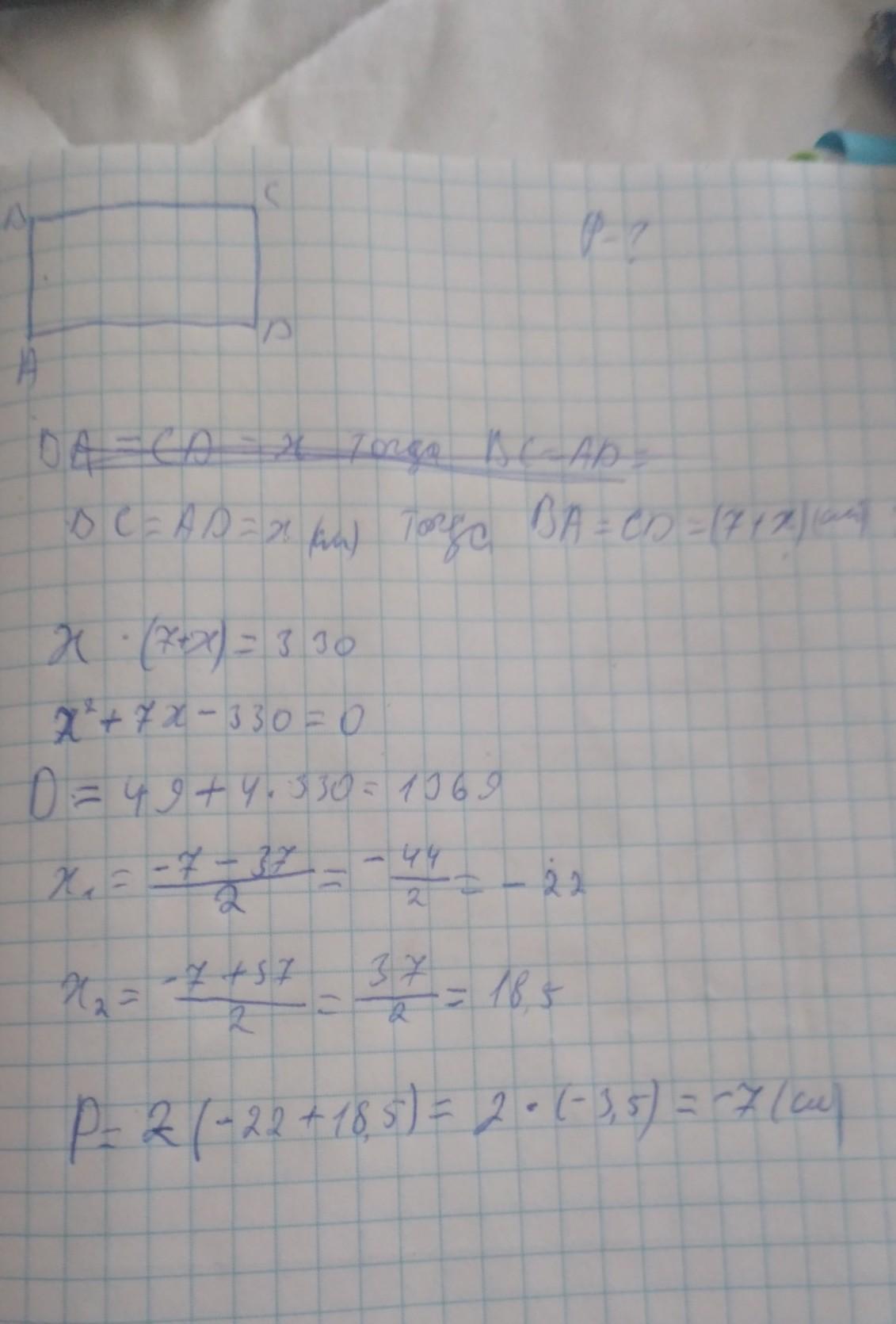 Решите задачу с помощью квадратного уравнения. Фото решенной задачи прикрепите к ответу. Найдите периметр прямоугольника, если известно, что его площадь равнв 330 кв.см, а длина на 7 см дольше ширины.