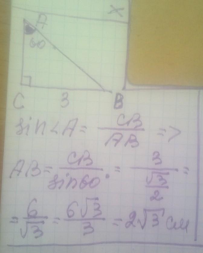 знайти доажину гіпотенузи прямокутного трикутника ABC якщо C=90° A=60° BC=3cm
