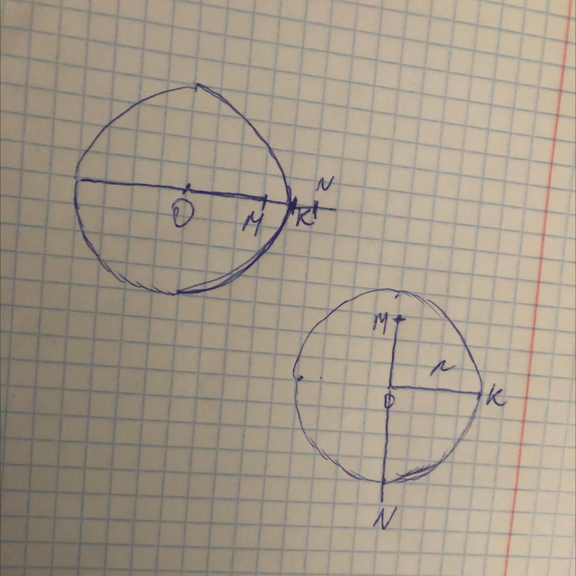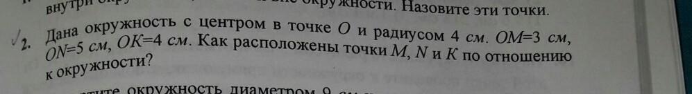 ON=5 см, OK=4 см. Как расположены точки M, N и К по отношению