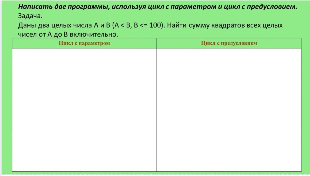 (Как я понял цикл с предусловием while, а цикл for с параметром)