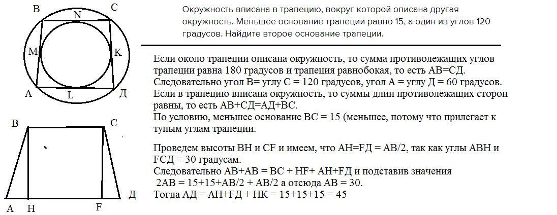 Окружность вписана в трапецию, вокруг которой описана другая окружность. Меньшее основание трапеции равно 15, а один из углов 120 градусов. Найдите второе основание трапеции.