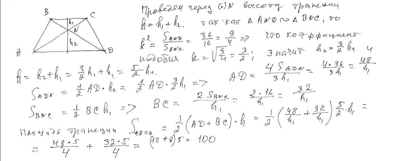 Диагонали АС и BD трапеции ABCD пересекаются в точке N. Площади треугольников AND и BNC равны соответственно 36 и 16. Найдите площади трапеции.