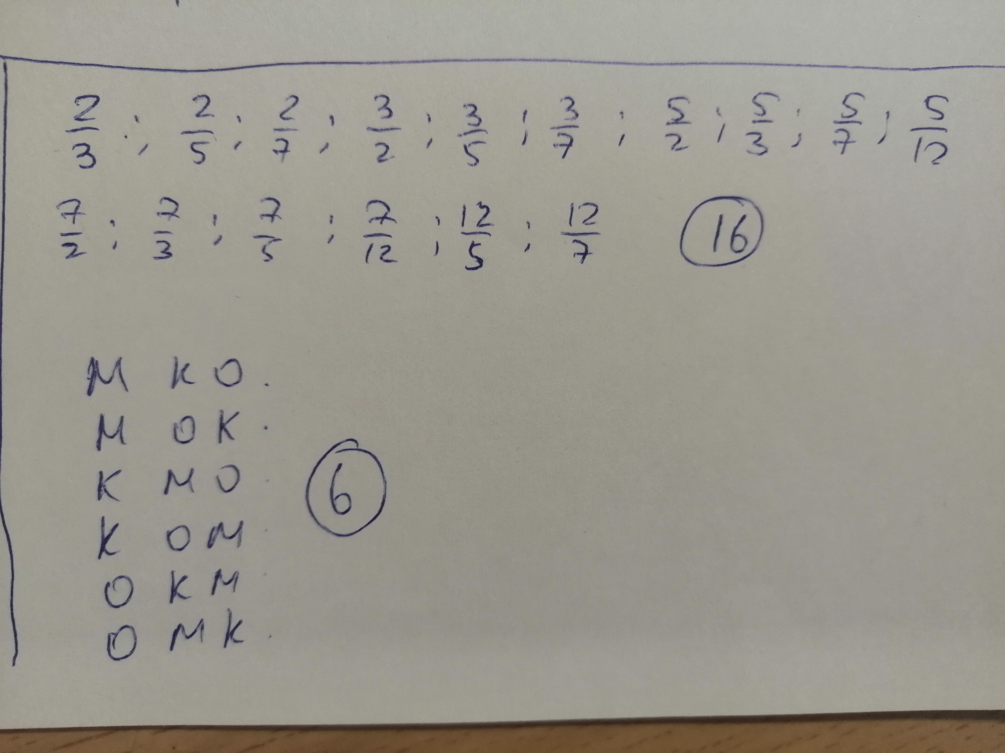 1)Сколько разных правильных несократимых дробей можно составить из чисел 2, 3, 5, 7, 12 так, чтобы числитель и знаменатель были разными?