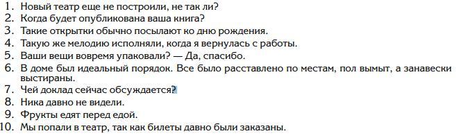 The new theater hasn't been built yet, has it? 2. When will your book be published? 3. These postcards are usually sent on birthday. 4. The same melody was played when I got home from work. 5. Did you pack your things on time? - Yes thank you . 6. The house was in perfect order. Everything was in place, the floor was cleaned, and the curtains were washed. 7. Whose report is being discussed now? 8. Nick has not been seen for a long time. 9. Fruit is eaten before meals. 10. We got to the theater, as tickets had been ordered long ago.