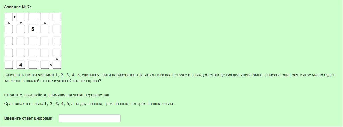 Заполнить клетки числами 1 2 3 4 5 , учитывая знаки неравенства так, чтобы в каждой строке и в каждом столбце каждое число было записано один раз. Какое число будет записано в нижней строке в угловой клетке справа?