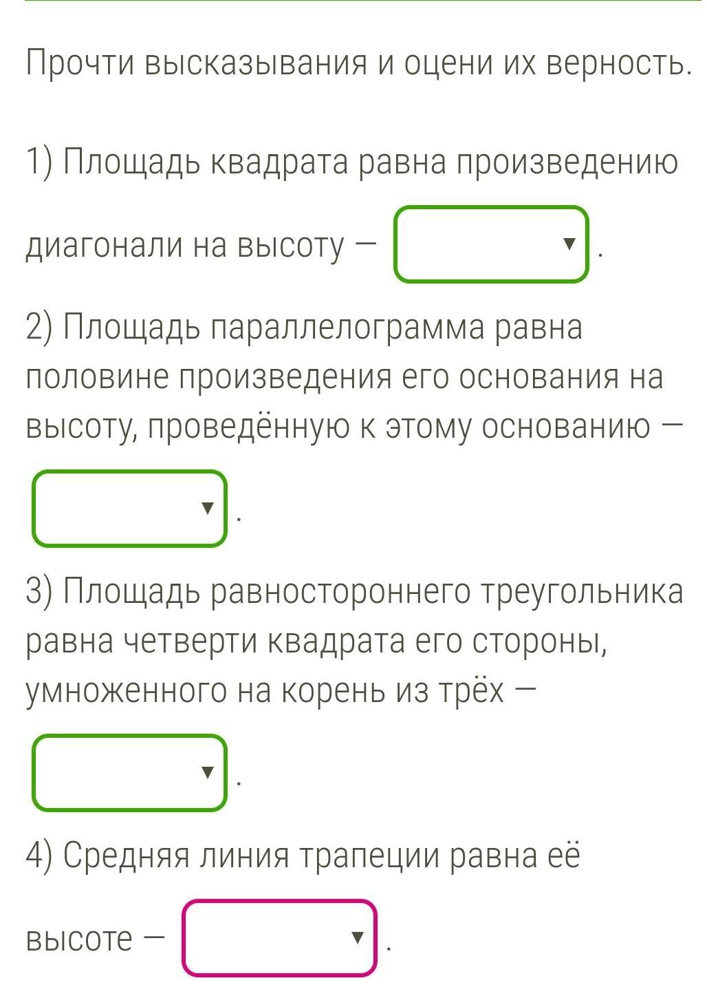 3) Площадь равностороннего треугольника равна четверти квадрата его стороны, умноженного на корень из трёх —