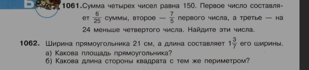 1061 1)150÷25×6=30(1 число)2)30÷5×7=42(2 число)3)150-(30+42)=78(3 и 4 числа вместе)4)78-24=54 (4 число)ответ 1число=30;2число=42;3число=28;4 число=54. 1062а)1,3/7=10/7 ширина 21÷7×10=30смширина,21×30=630(см)площадь прямоугольника. б)630÷4=157,5(см)длина стороны квадрата. в ответе б неуверена.