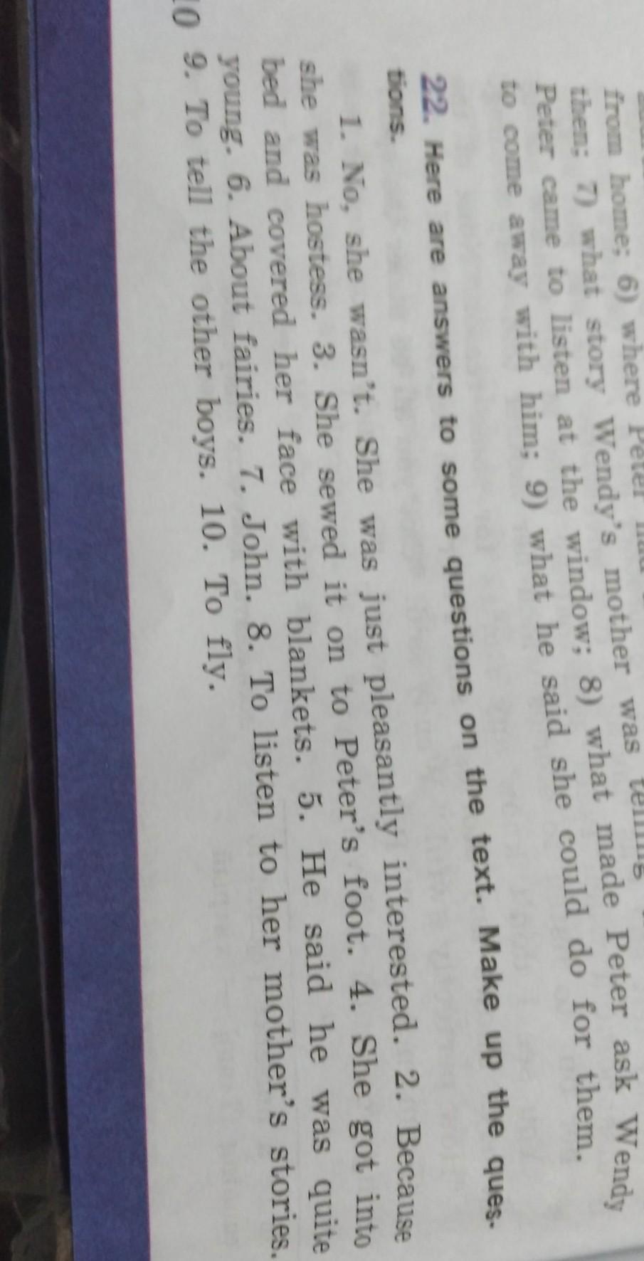 1) Was it pleasantly interested. 2. Was she a hostess? 3. Who sewed it onto Peter's foot? 4. Did she get into bed and cover her face with blankets? 5. Who said that he was quite young? 6. What does it about? 7. Who was that person? 8. Who was listening to mother's stories? 9. Did he tell the other boys or girls? 10. What had they decided to do in that situation?