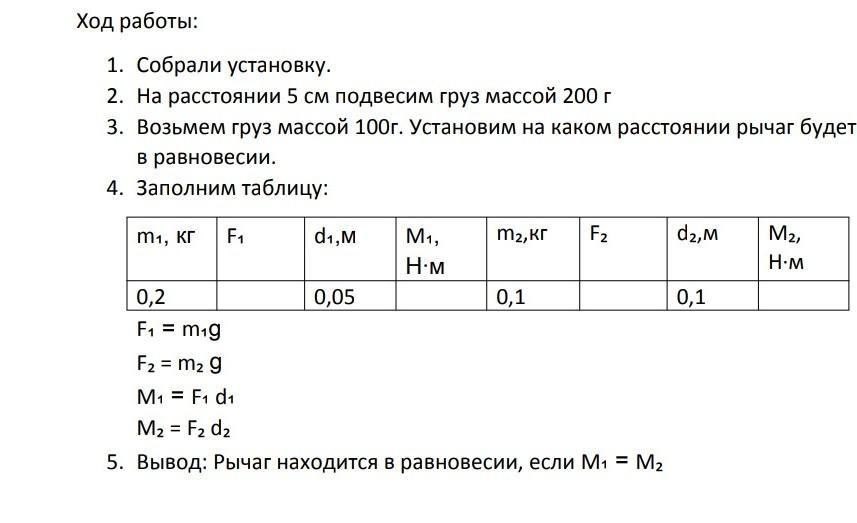5) Т.к. M1 = M2, то рычаг находится в состоянии равновесия