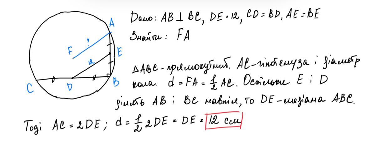 Хорди АВ і ВС кола перпендикулярні, а видстань між їхніми серединами дорівнює 12 см. Знайдіть радіус кола.