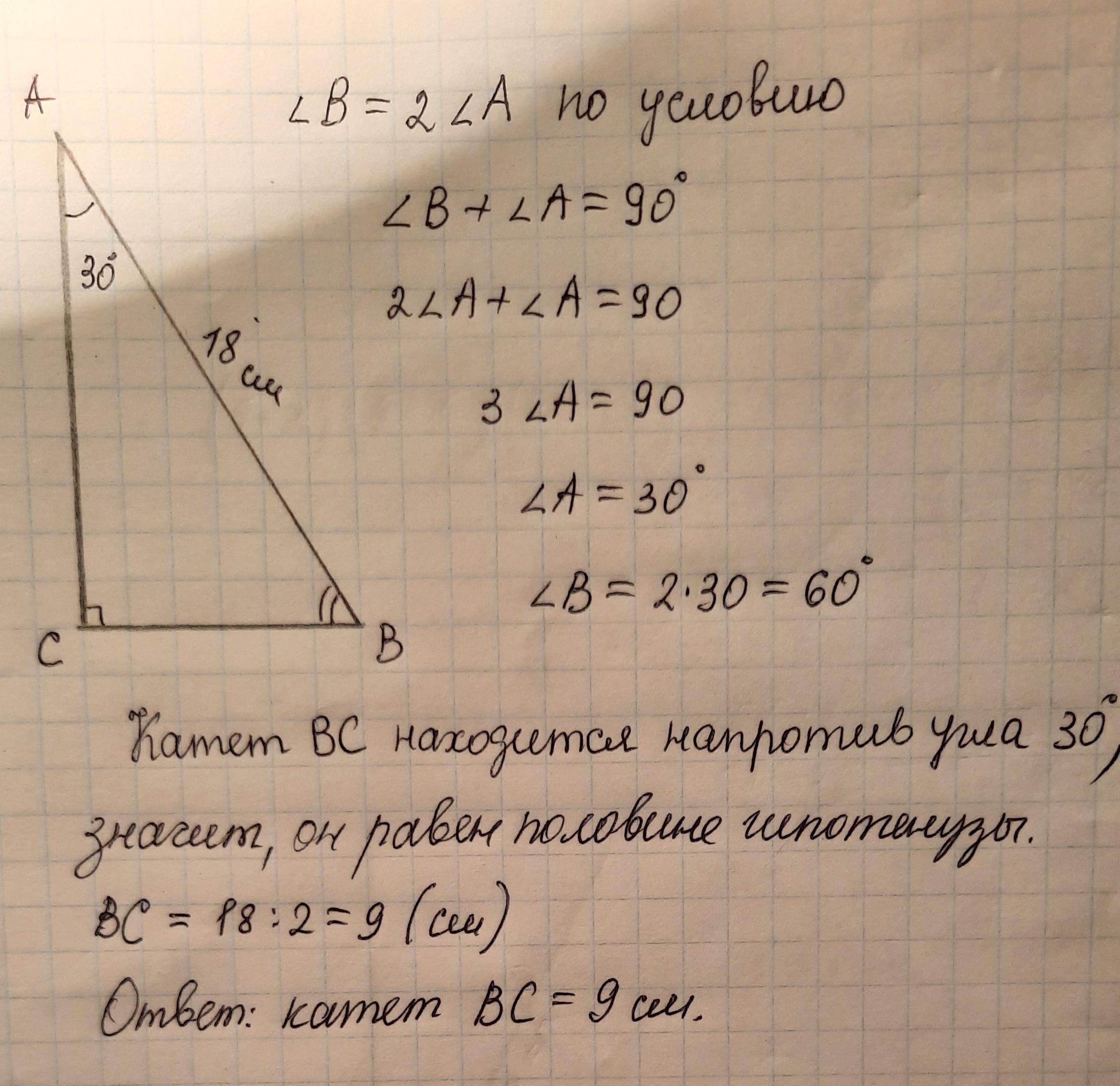 В прямоугольном треугольнике АВС, изображенном на рисунке, угол А в два раза меньше угла В, а гипотенуза АВ равна 18 см. Найдите