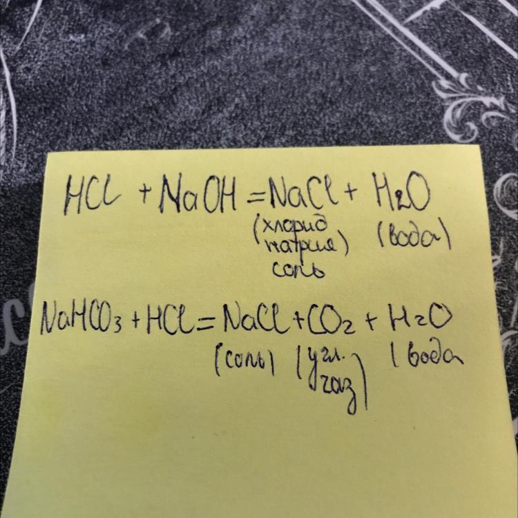 Гидрокарбонат натрия + Хлороводород = Хлорид Натрия + Вода + Оксид Углерода(Iv)