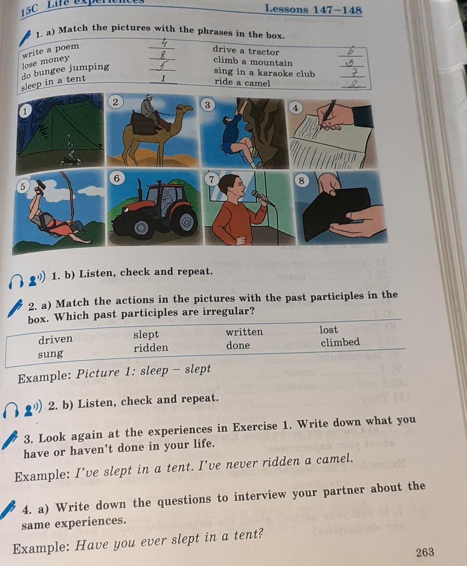 ex 2 1-slept 2 ridden 3 climbed 4 written 5 done 6 driven 7sung 8 lost