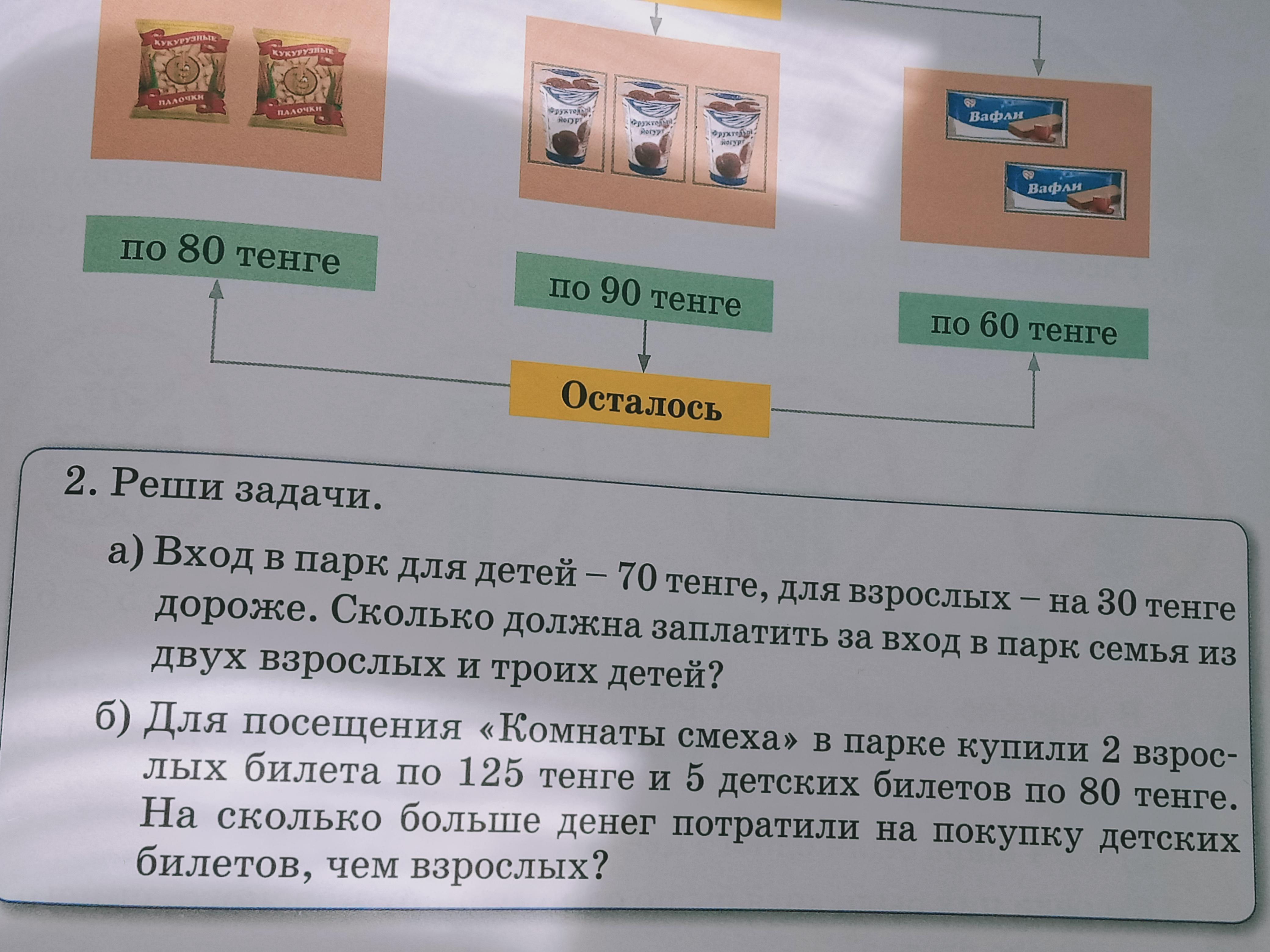 1) 125 × 2 = 250 ( тенге ) - 2 взрослых билета .