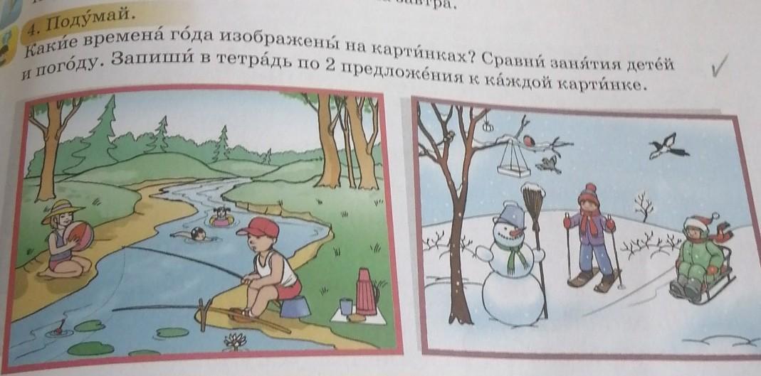 и погоду. Запиши в тетрадь по 2 предложéния к каждой картинке.