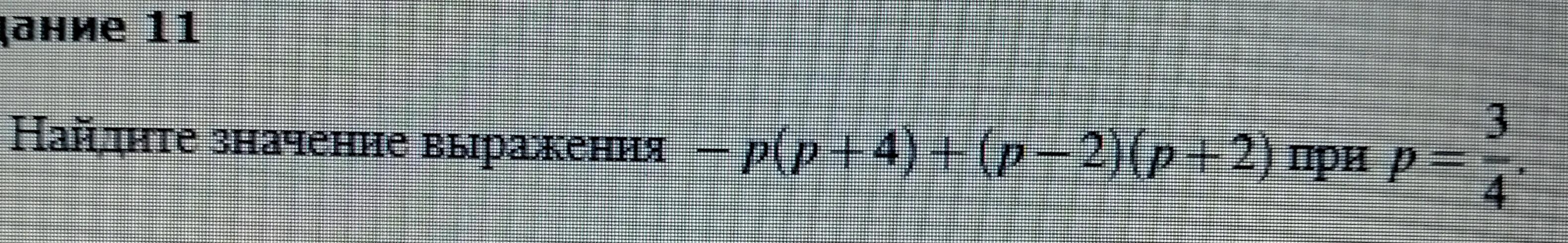 Мы раскрыли скобки и получилось уравнение -р2-4р+р2-4=0, -р2 и р2 самоуничтожаются, тогда выходит -4p-4=0. Мы подставляем 3/4 потому что так сказано в задаче, что р=3/4, вычисляем выходит -7.