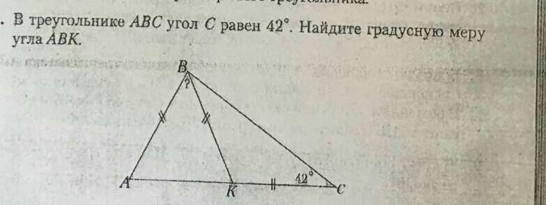 Угол СBK = 42°, поскольку треугольник который мы сейчас рассматриваем равнобедренный.