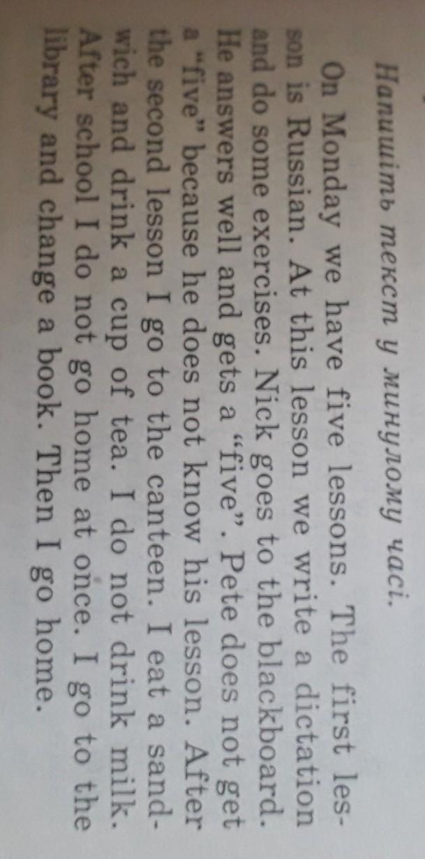 On Monday we had five lessons. The first lesson was Russian. At this lesson we wrote a dictation and did some exercises. Nick went to the blackboard. he was answers well and got a 5. Pite didn't know his lesson. After the second lesson I went to the canteen and I eat a sandwich and drunk a cup of tea. I didn't drunk milk. After school I didn't go home at once. I went to the library and changed a book. Then I went to home