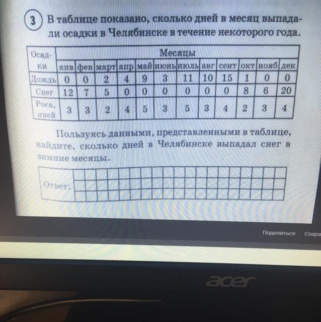 В таблице показано, сколько дней в месяц выпадали осадки в Челябинске в течение некоторого года.Пользуясь данными, представленными в таблице, найдите, сколько дней в Челябинске выпадал снег в зимние месяцы.