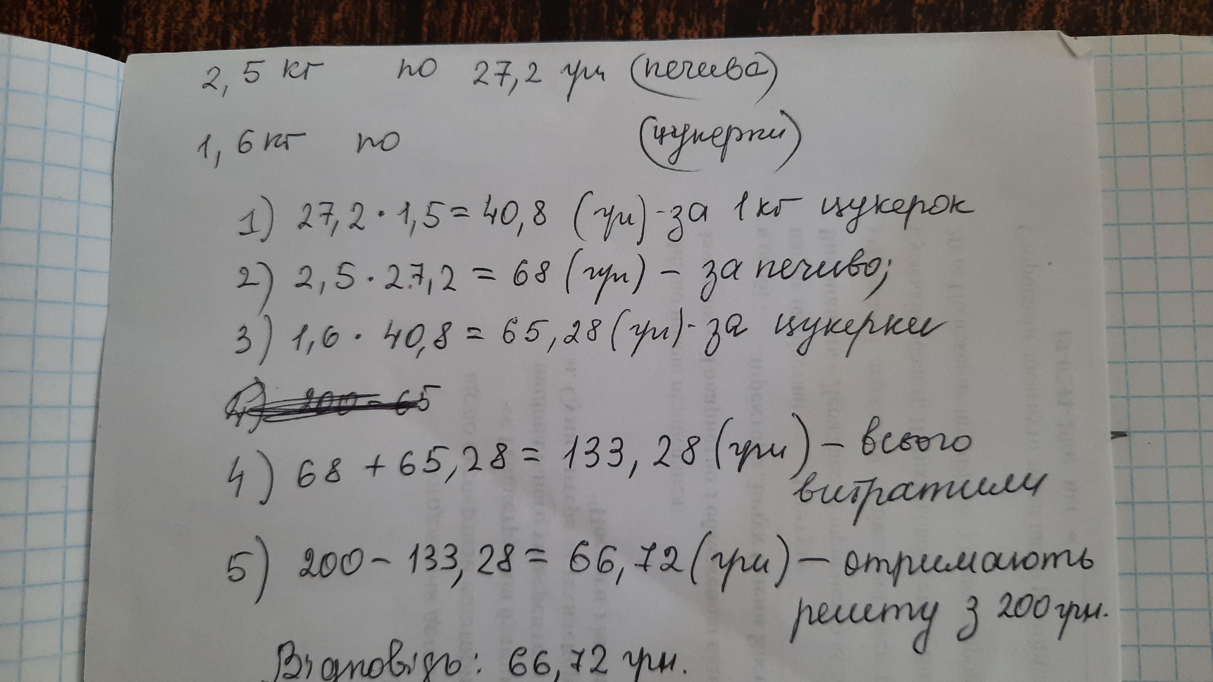 3) 200 - (68 + 65,28) = 200 - 133,28 = 66,72 (грн) - сдача.