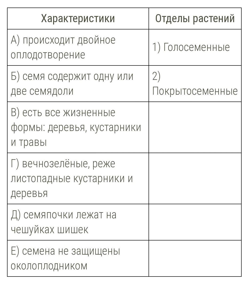 Установи соответствие между характеристиками и отделами растений: к каждой позиции, данной в первом столбце, подбери соответствующую позицию из второго столбца.
