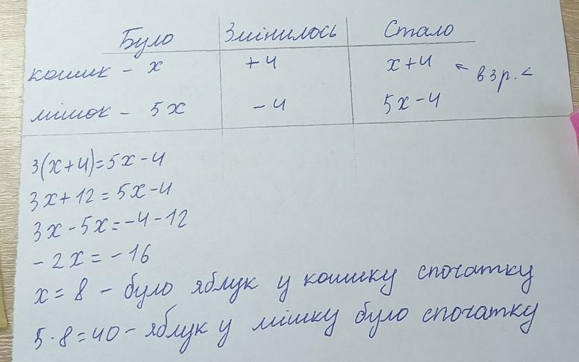 у мішку яблук у 5 разів більше ніж у кошику . Після того як з мішка переклади 4 яблука в кошик ,в ньому яблук стало в 3 рази менше ,ніж у мішку. Скільки спочатку було яблук у мішку і скільки в кошику