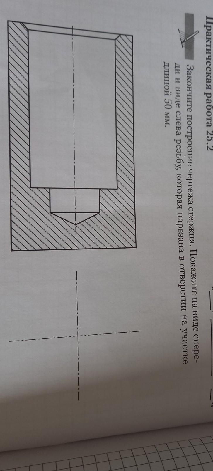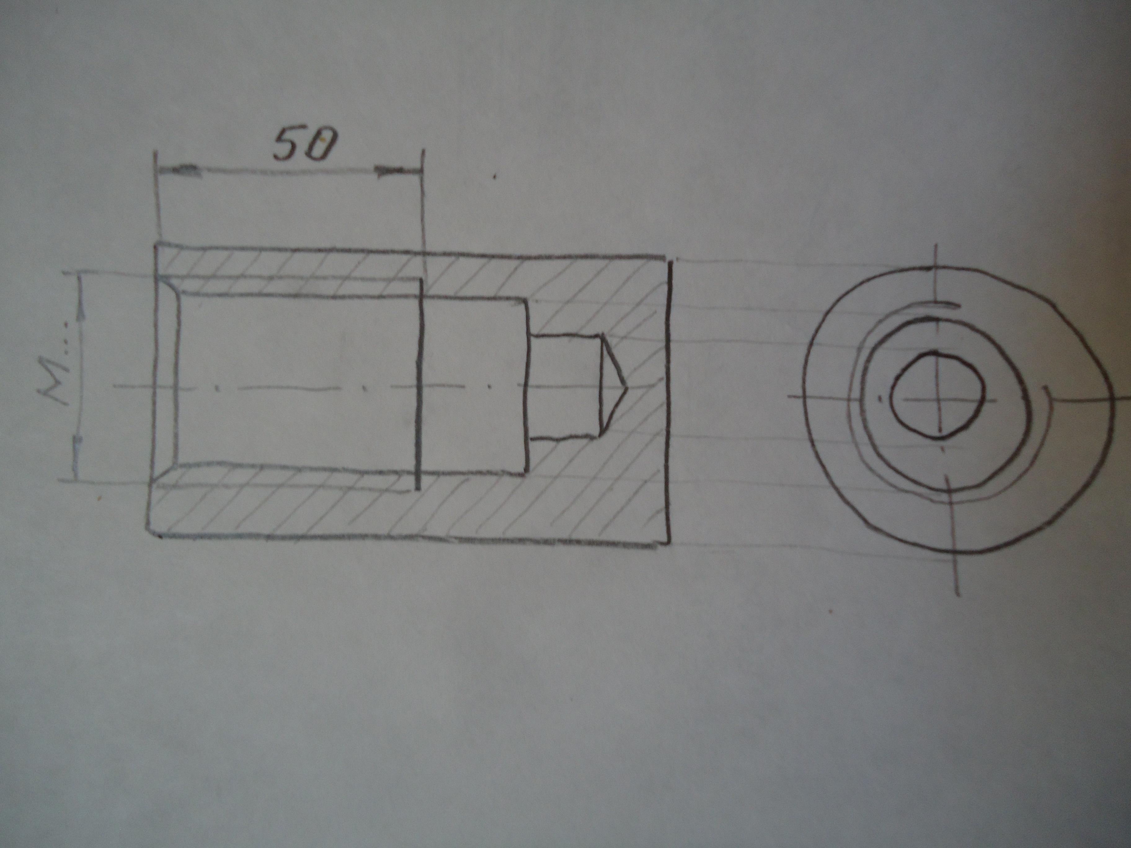 Резьба наносится на чертёж на виде спереди тонкой сплошной линией и ограничивается сплошной толстой линией, на виде слева резьба наносится в виде окружности на 3/4 круга тонкой сплошной линией. Обозначается резьба с буквой М (метрическая).