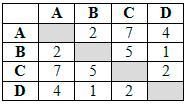 Между населёнными пунктами A, B, C, D построены дороги, протяжённость которых (в километрах) приведена в таблице. Определите длину кратчайшего пути между пунктами A и C, проходящего через пункт B. Передвигаться можно только по дорогам, протяжённость которых указана в таблице.