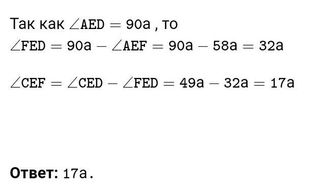 задача: Из вершины прямого угла AED проведены два луча ЕС и EF так, что ∠AEF = 58°, ∠CED = 49°. Вычислите величину угла CEF.помогите с решением.
