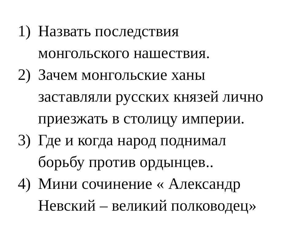 1. Большинство русских княжеств было захвачено и разорено монголо-татарами. Около 40% населенных пунктов было уничтожено и не восстановилось. Огромные человеческие жертвы привели к экономическому и нравственному упадку русских земель. Исчезли отдельные виды ремесла и профессиональные навыки.