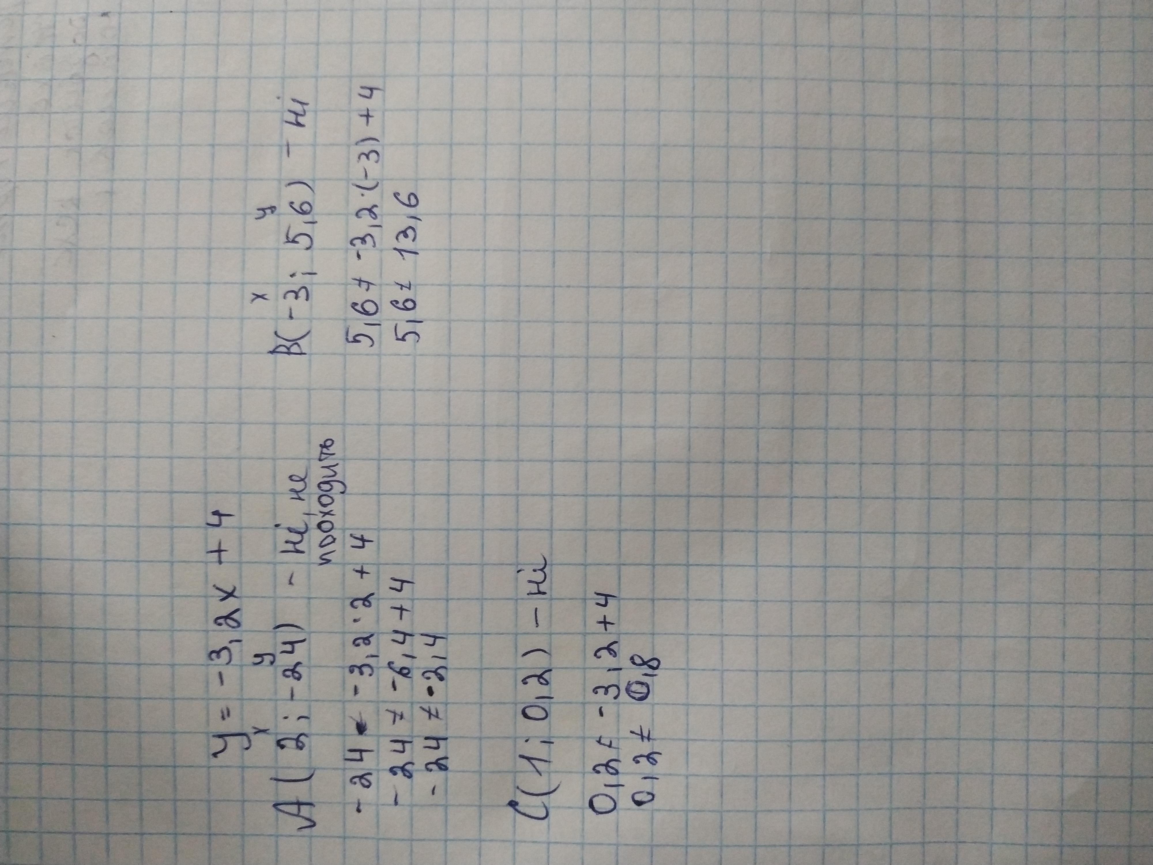 Не виконуючи побудови графіка функції y = -3,2x+4 , визначте яка з даних точок проходить цей графік : A (2;-24); B (-3;5,6) ; (1;0,2)