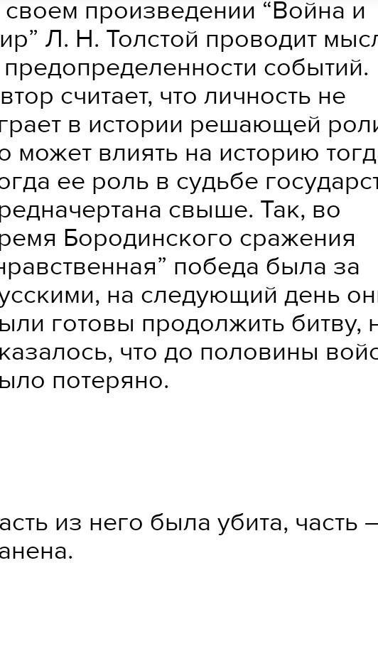 В своем произведении “Война и мир” Л. Н. Толстой проводит мысль о предопределенности событий. Автор считает, что личность не играет в истории решающей роли, но может влиять на историю тогда, когда ее роль в судьбе государства предначертана свыше. Так, во время Бородинского сражения “нравственная” победа была за русскими, на следующий день они были готовы продолжить битву, но оказалось, что до половины войска было потеряно.
