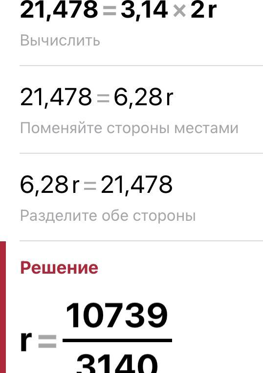 Длина окружности равна 21,478 см. Значение числа π≈3,14.