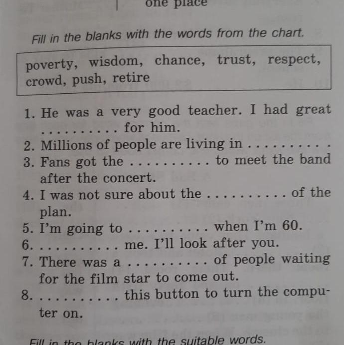 feel in the blanks the words from the chart Poverty, wisdom, chance, trust, respect, crowd, push, retire