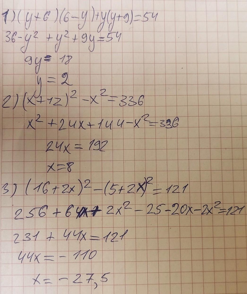 Решите пж уравнения и запишите вместе с проверкой 1) (у+6) (6-у) +у(у+9)=54 2) (х+12)²-х²=336 3) (16+2х)²-(5+2х)²=121